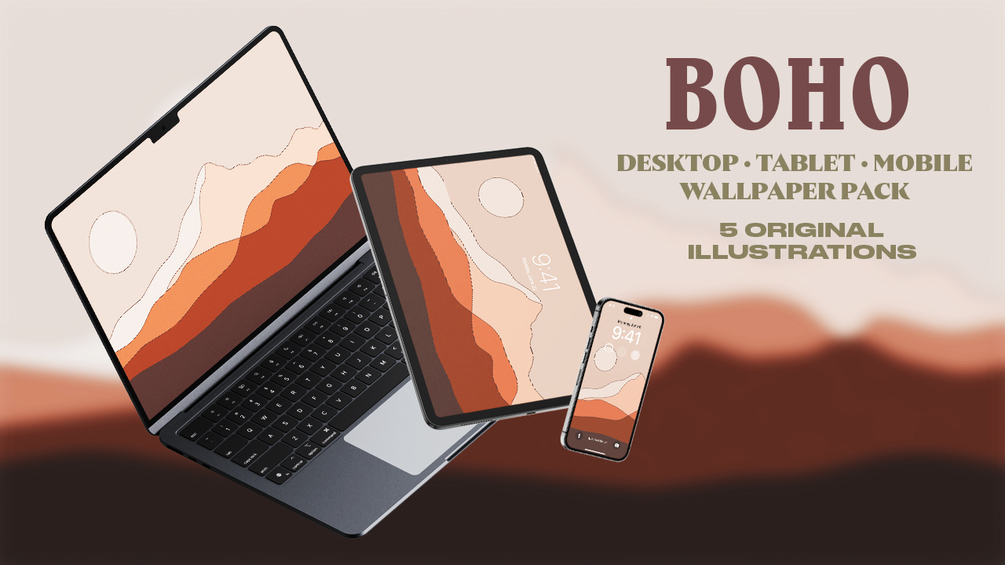 "Boho" Wallpaper pack comes with 5 Illustrations perfect for any operating system such as iOS, Android, MacOS, PC, and more. Each variation comes with a desktop, tablet, and mobile version. Mix and match and see what works best for you!